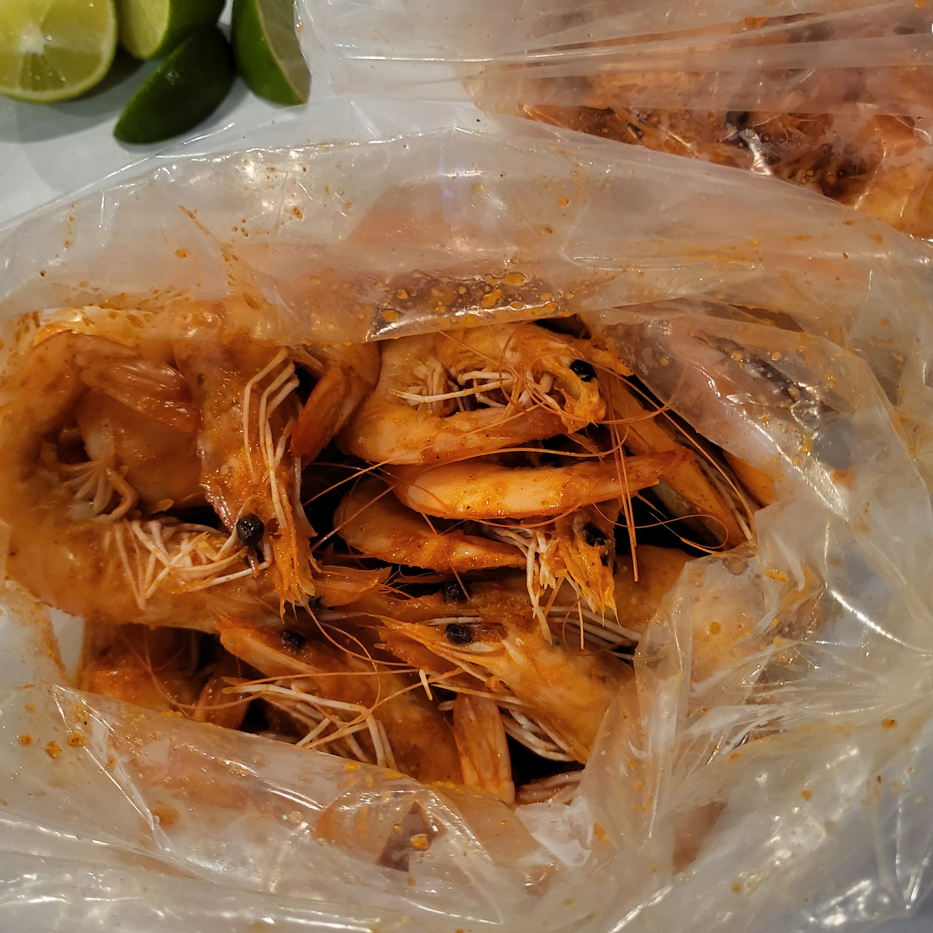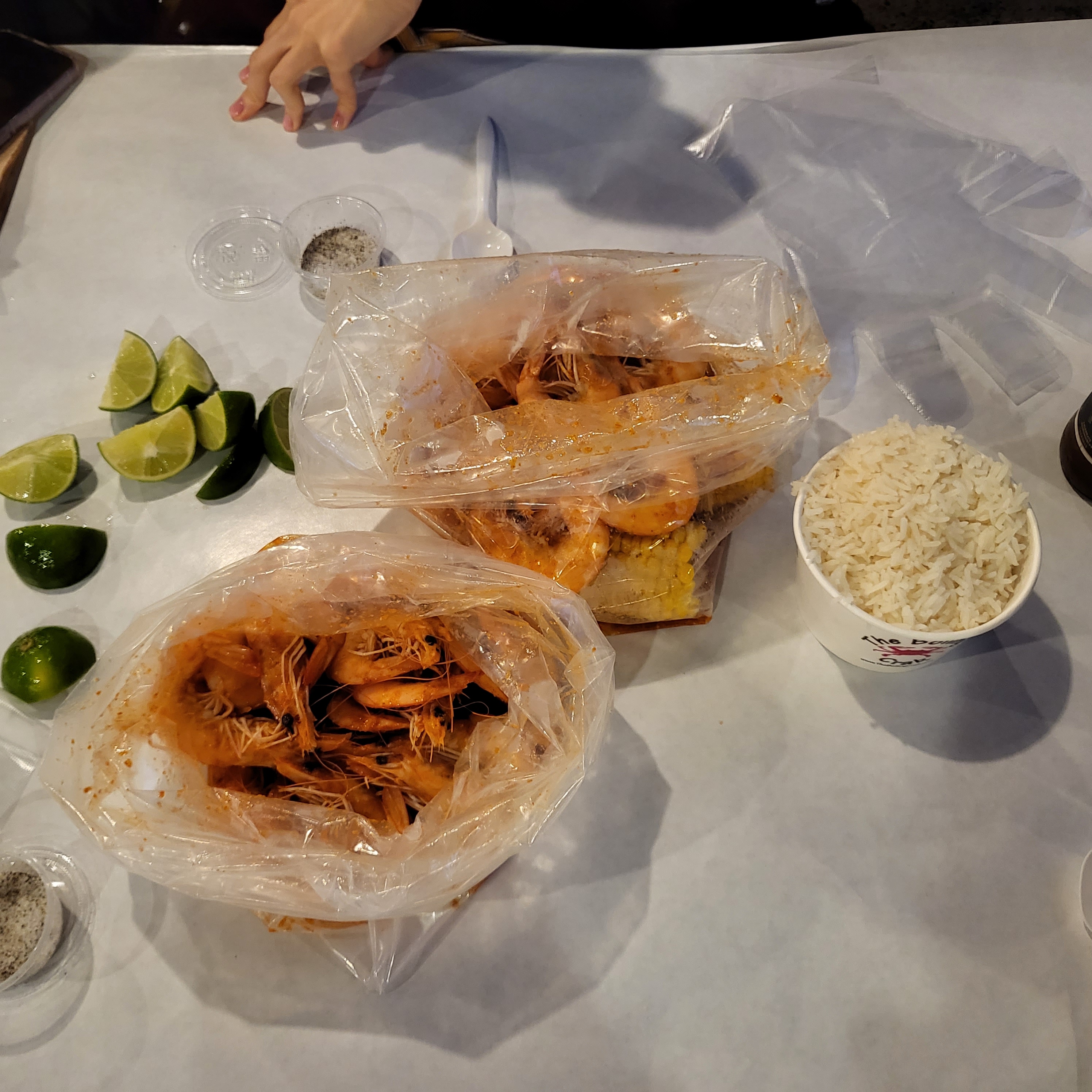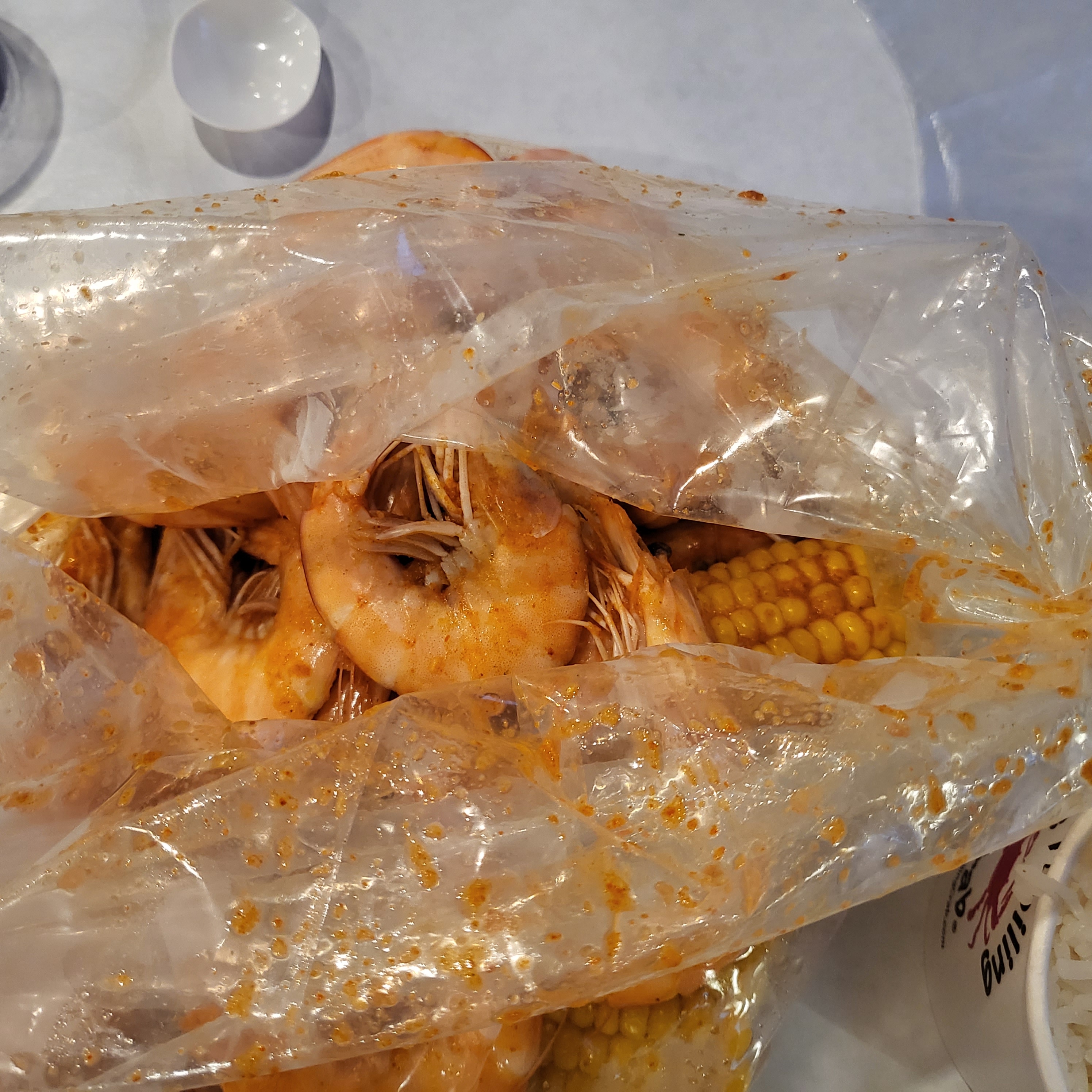이 보일링 크랩 메뉴는 이렇게 봉지에 담긴 상태로 서빙됩니다~ 저처럼 봉지째로 두어도 되지만 테이블에 쏟아두고 새우를 까드시는 분도 많답니다~