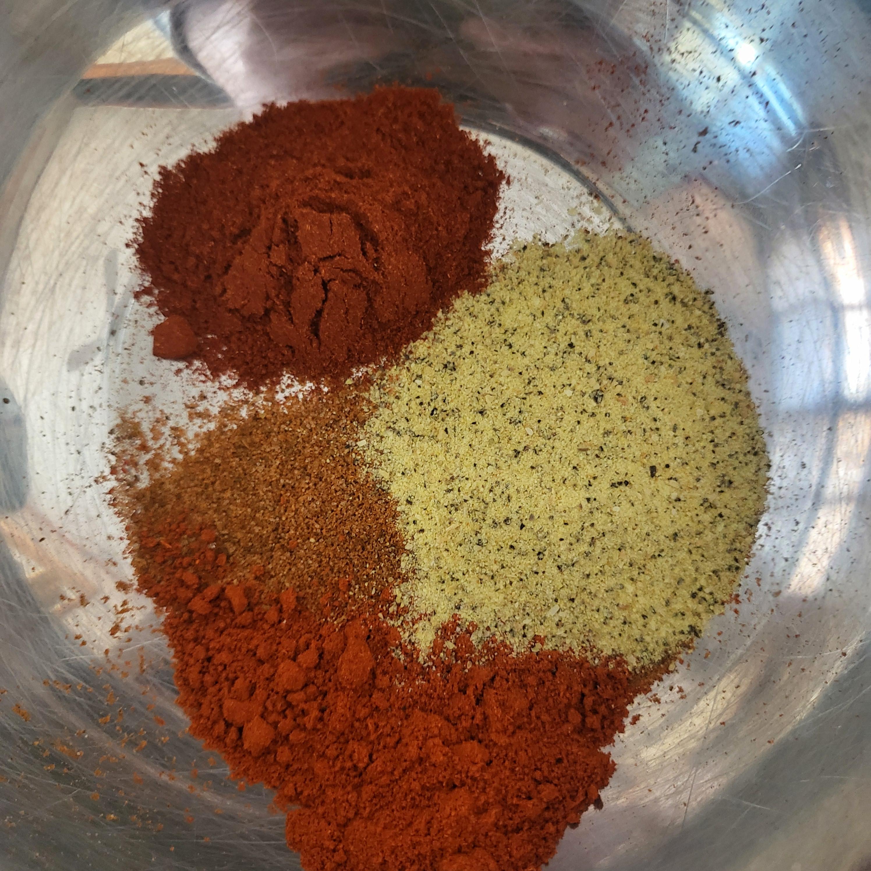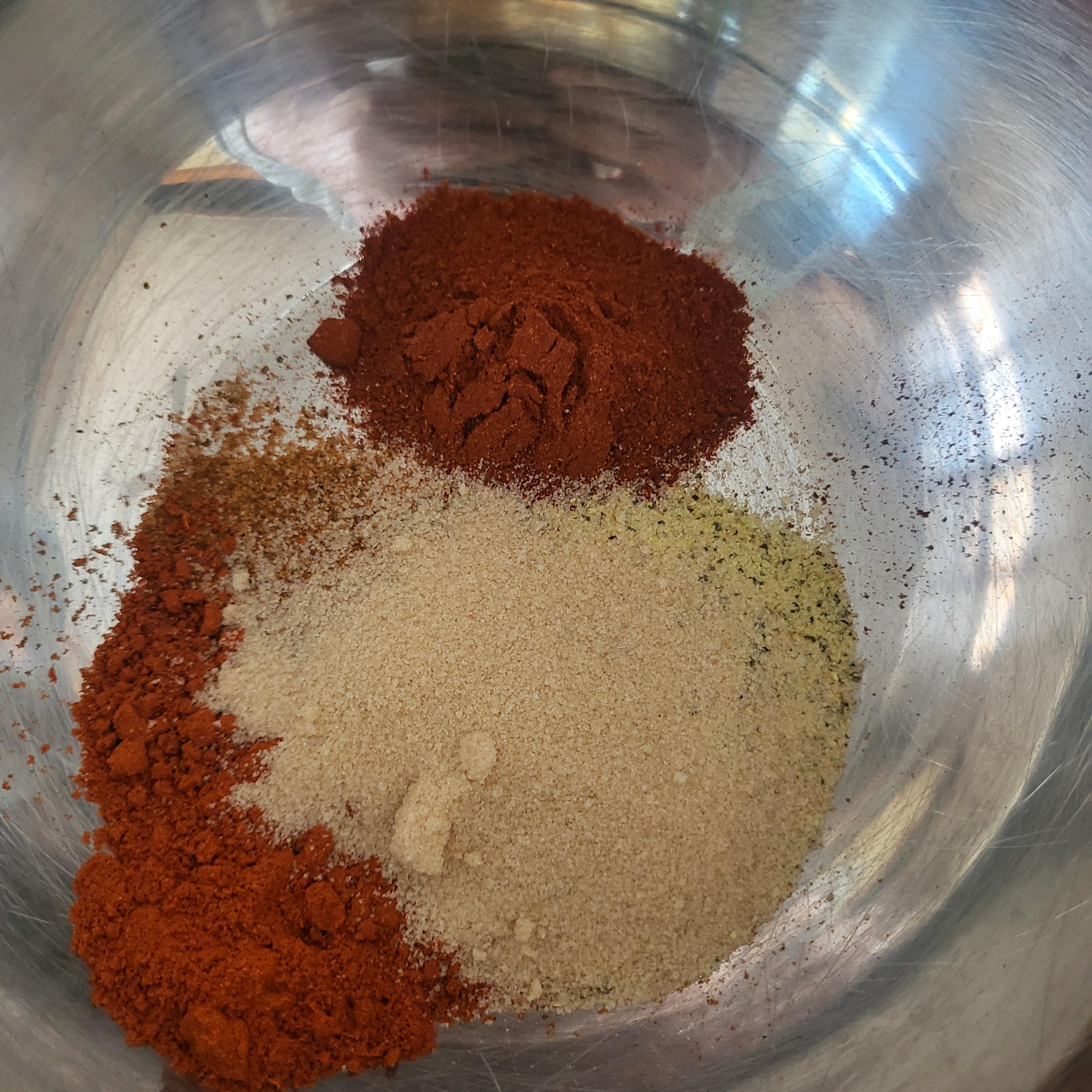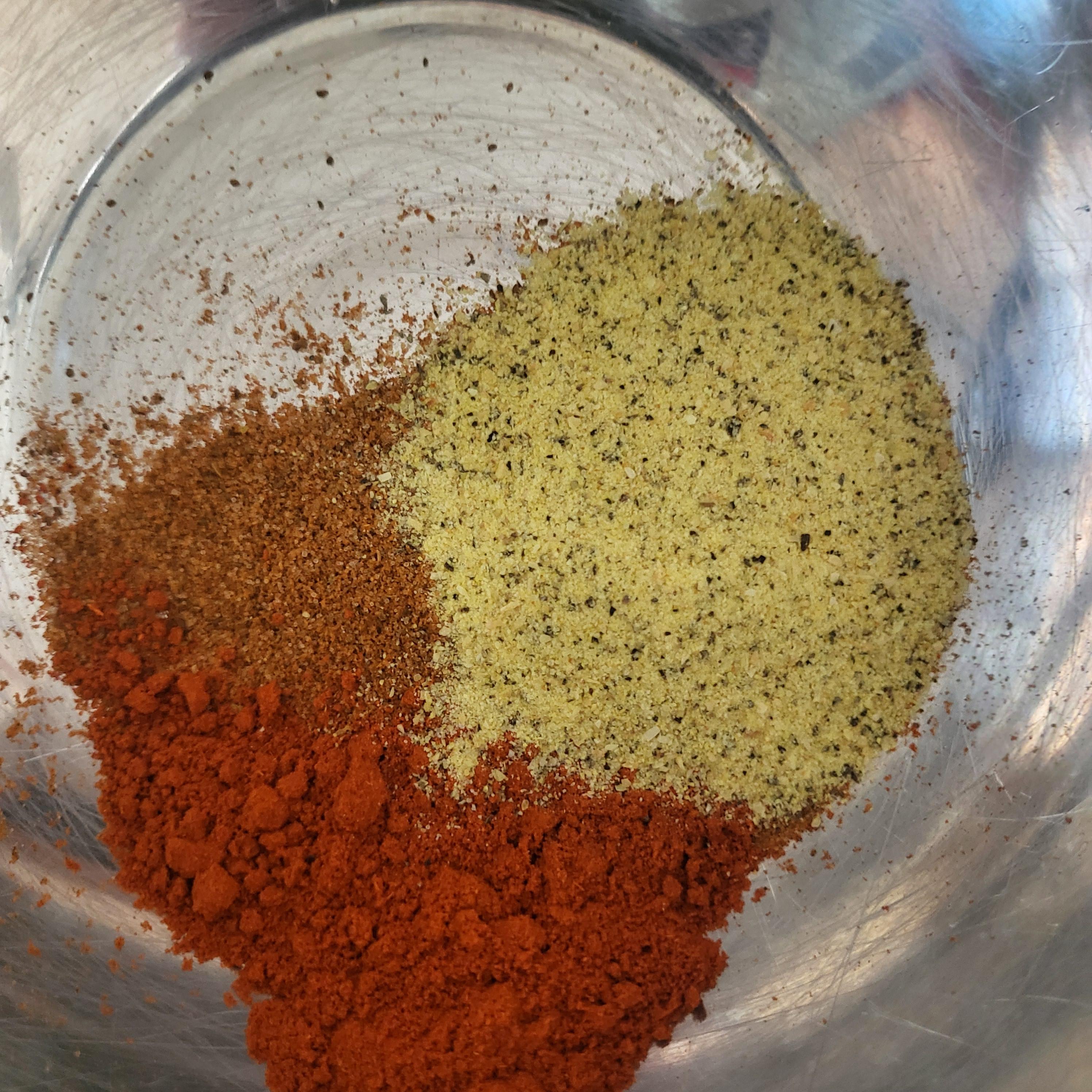 위의 올드베이 2 큰술, 레몬페퍼 1 큰술, 카옌 페퍼 또는 고운고춧가루 1 큰술 ,파프리카 가루 1 큰술, 설탕 1 큰술을 넣고 배합하여 줍니다.