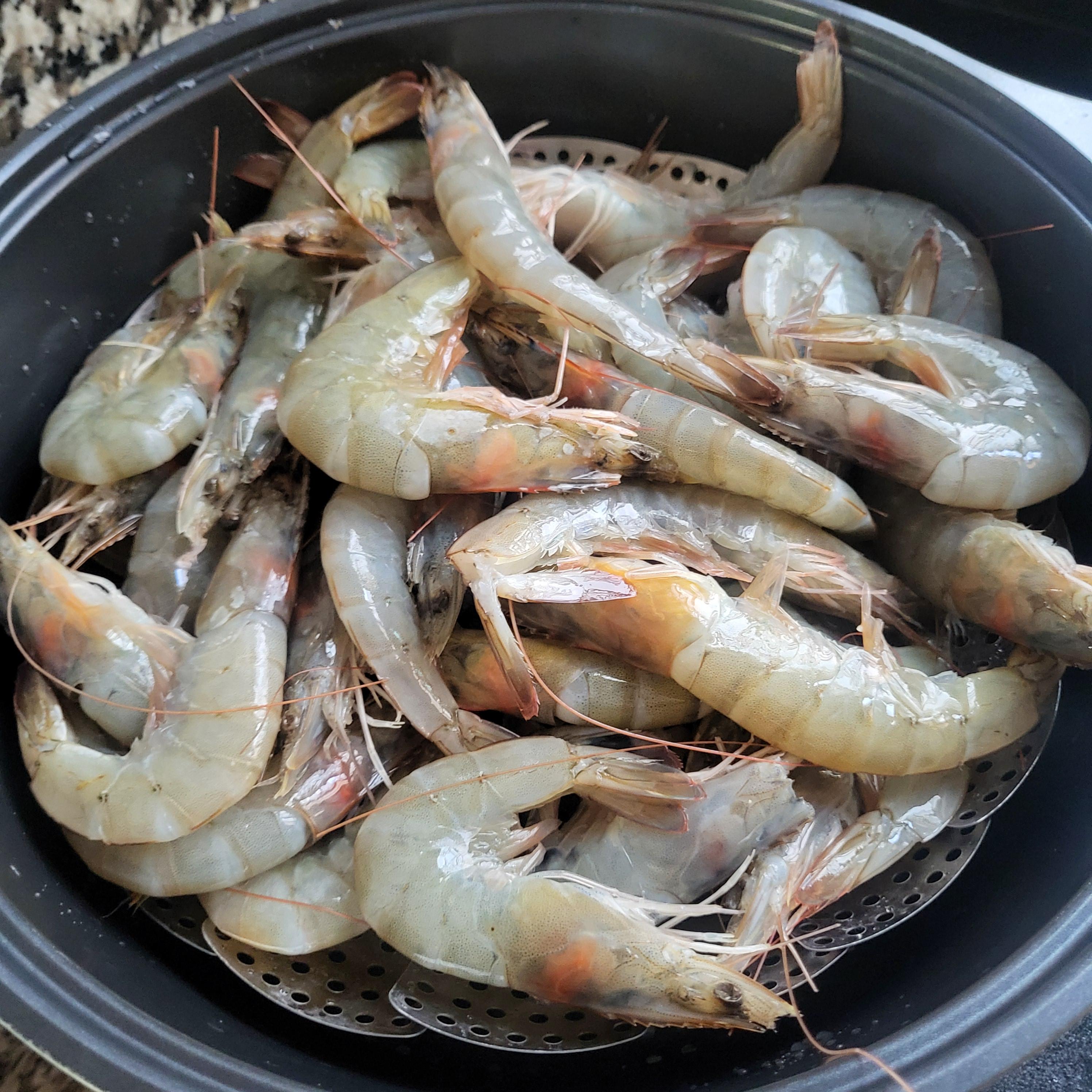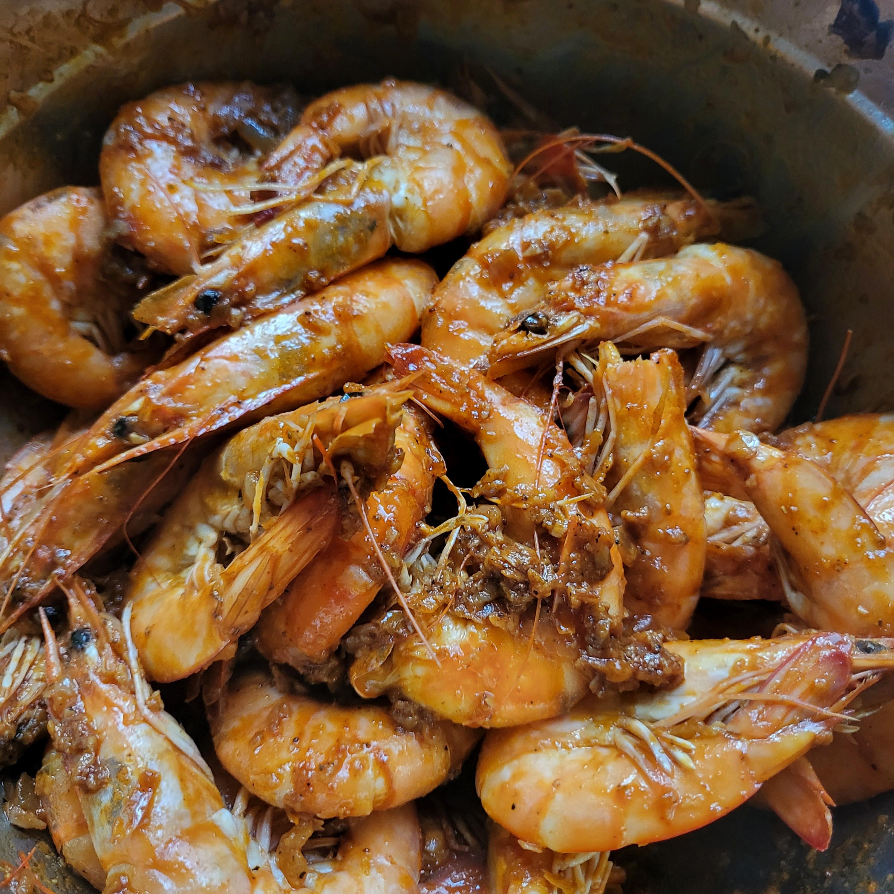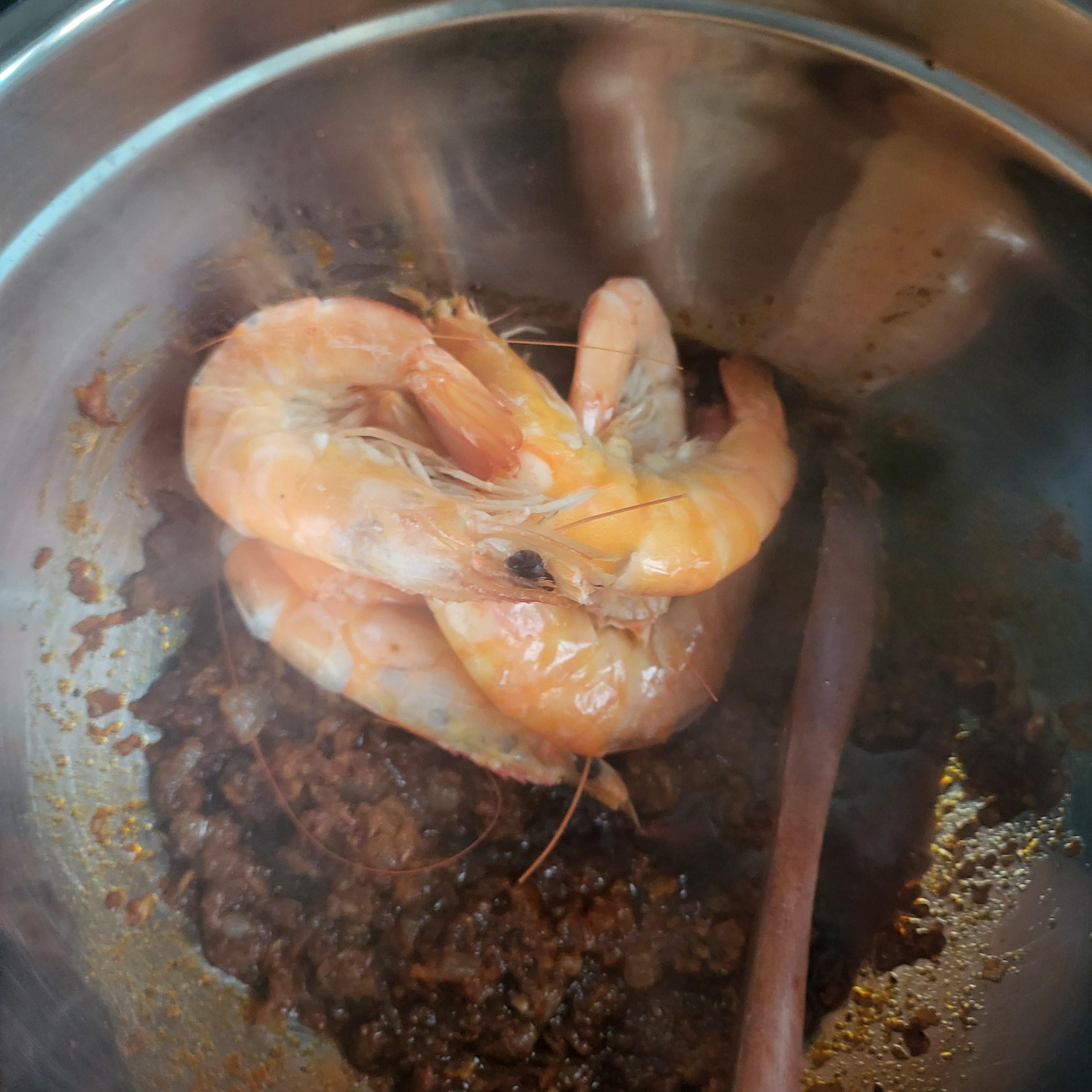 시즈닝이 많은 편이고, 시즈닝만 넣으면 살짝 새우와 덜 어우러지니 새우찔때 나온 육수를 반국자 정도 같이 넣고 새우를 버무려 줄거에요.
