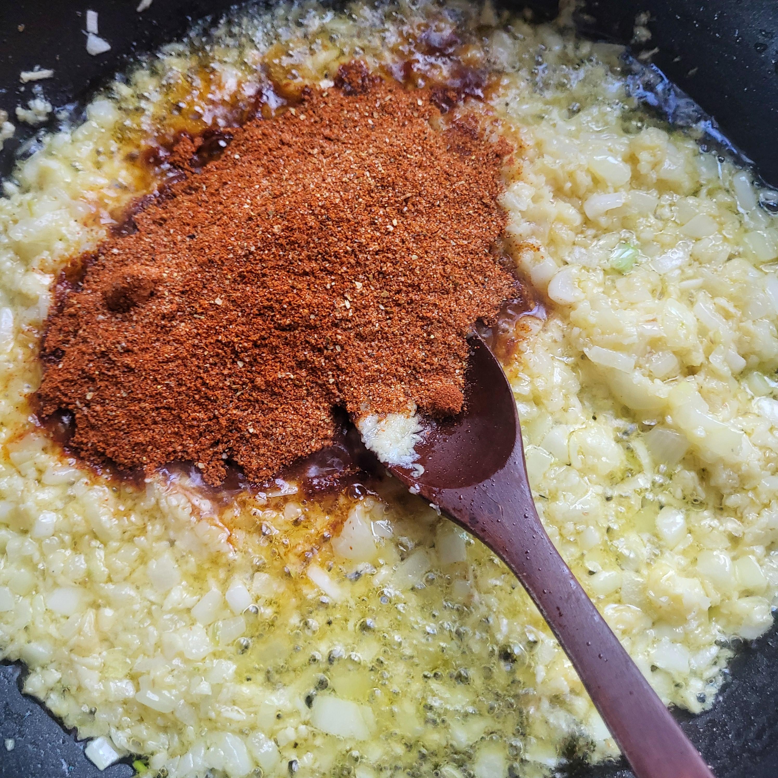 양파까지 다 볶아지면 배합해 둔 시즈닝 가루를 넣고 가루가 뭉치지 않게 풀어주세요.