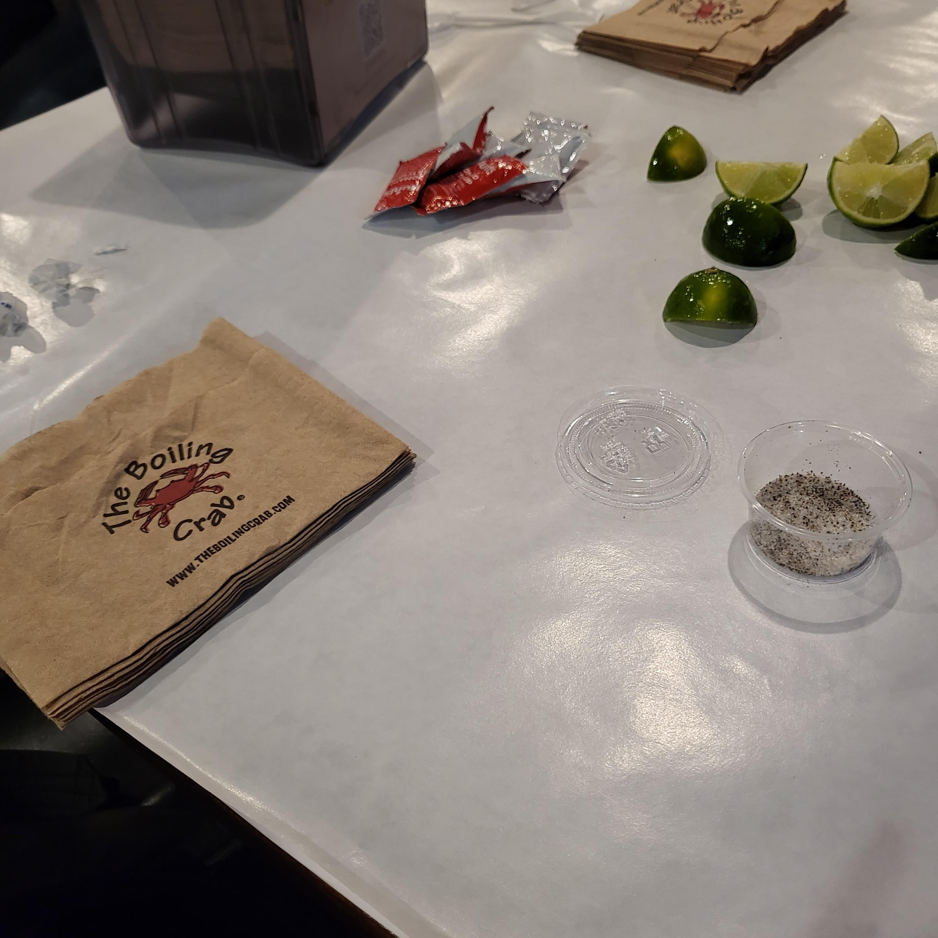 기본 테이블 세팅에는 라임과 소금을 같이 주시는 데요. 저 소금에 라임즙을 짜서 새우를 찍어먹으면 그게 또 별미랍니다~