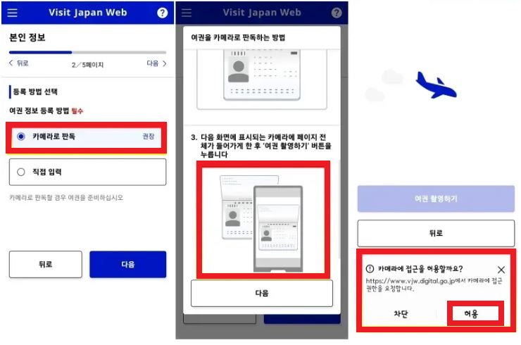 준비해둔 여권으로 여권정보를 입력해줍니다. 카메라인식 기능으로 등록하면 간편합니다.