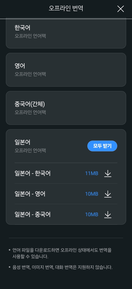 지원언어는 한국어, 영어, 중국어, 일본어로 4가지 미리 다운받으면 오프라인에서도 일반 번역기능이 가능합니다