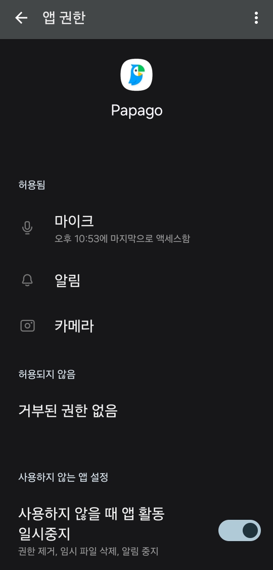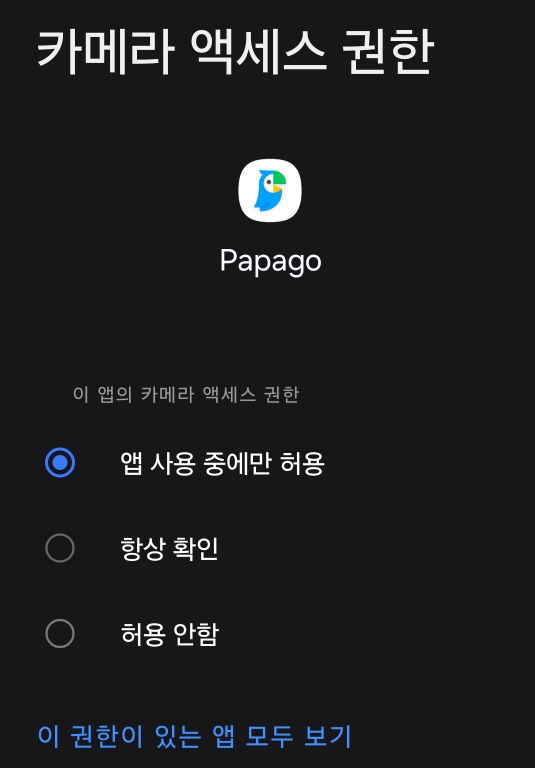 권한은 앱 사용 중에만 허용 또는 항상 확인 으로 설정해야 이미지 번역이 가능합니다.