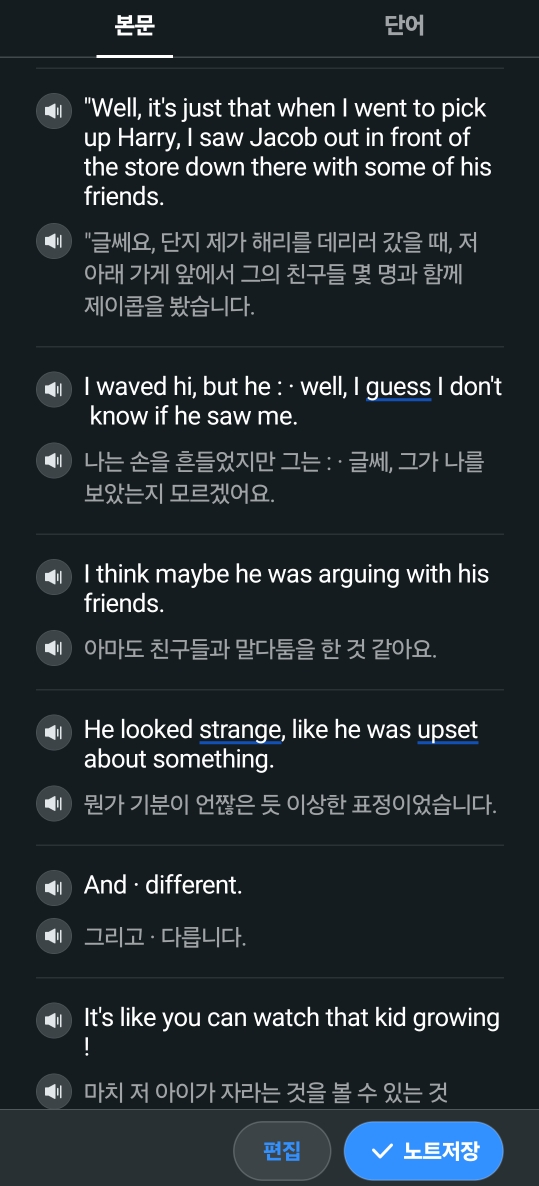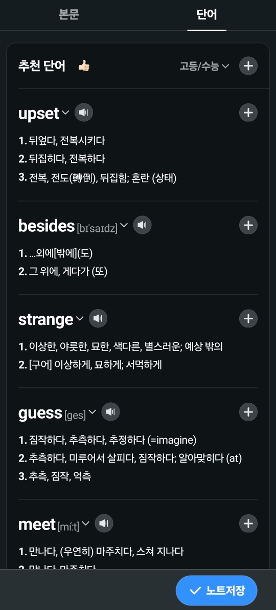 학습기능에서는 추가적으로 [본문]옆의 [단어]를 누르면 공부하기 편하게 주요단어들이 나옵니다.