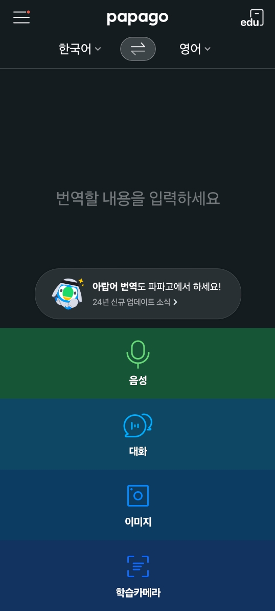 이 첫 화면의 일반적인 번역 검색 기능 또한 파파고에서는 오프라인으로도 사용가능한데요.